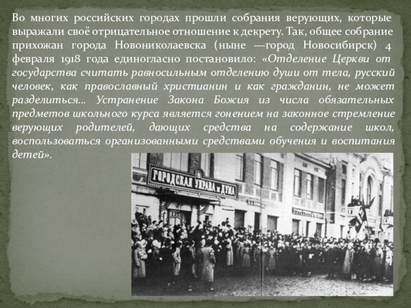 (ныне —город Новосибирск) 4 февраля 1918 года единогласно постановило: «Отделение Церкви от государства считать равносильным отделению души от тела, русский человек, как православный христианин и как гражданин, не может разделиться… Устранение Закона Божия из числа обязательных предметов школьного курса является гонением на законное стремление верующих родителей, дающих средства на содержание школ, воспользоваться организованными средствами обучения и воспитания детей».