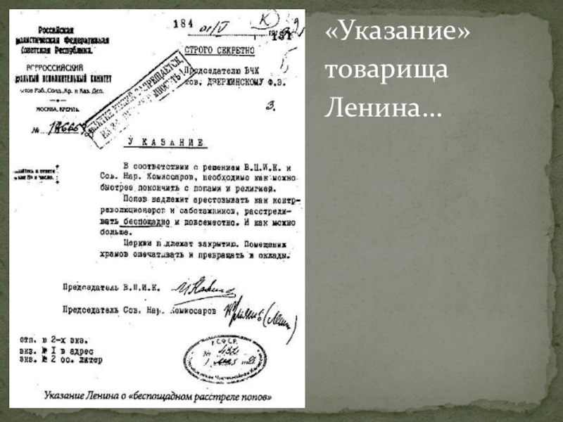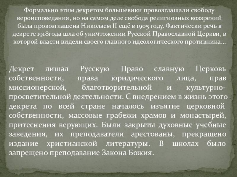 1905 году. Фактически речь в декрете 1918года шла об уничтожении Русской Православной Церкви, в которой власти видели своего главного идеологического противника…