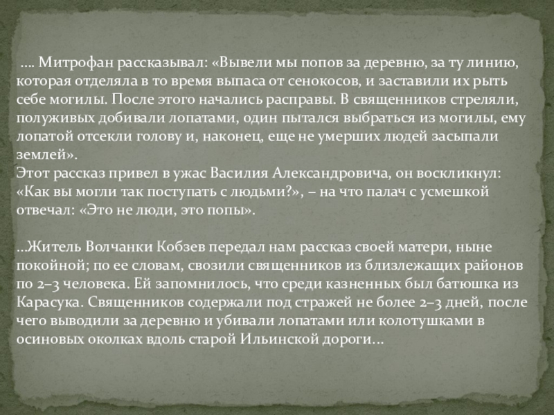 Слайд 86 …. Митрофан рассказывал: «Вывели мы попов за деревню, за ту