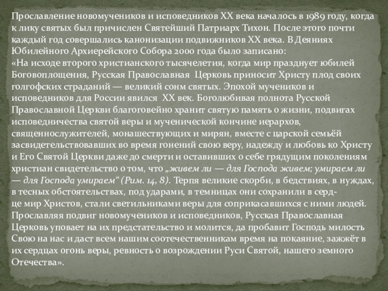 «На исходе второго христианского тысячелетия, когда мир празднует юбилей Боговоплощения, Русская Православная Церковь приносит Христу плод своих голгофских страданий — великий сонм святых. Эпохой мучеников и исповедников для России явился XX век. Боголюбивая полнота Русской Православной Церкви благоговейно хранит святую память о жизни, подвигах исповедничества святой веры и мученической кончине иерархов, священнослужителей, монашествующих и мирян, вместе с царской семьёй засвидетельствовавших во время гонений свою веру, надежду и любовь ко Христу и Его Святой Церкви даже до смерти и оставивших о себе грядущим поколениям христиан свидетельство о том, что „живем ли — для Господа живем; умираем ли — для Господа умираем“ (Рим. 14, 8). Терпя великие скорби, в бедствиях, в нуждах, в тесных обстоятельствах, под ударами, в темницах они сохранили в серд-