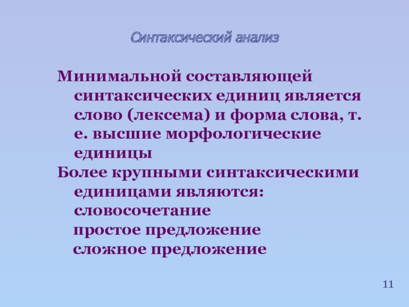 Минимальной составляющей синтаксических единиц является слово (лексема) и форма