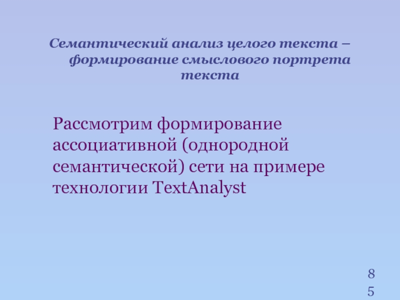 Слайд 85Рассмотрим формирование ассоциативной (однородной семантической) сети на примере технологии TextAnalyst