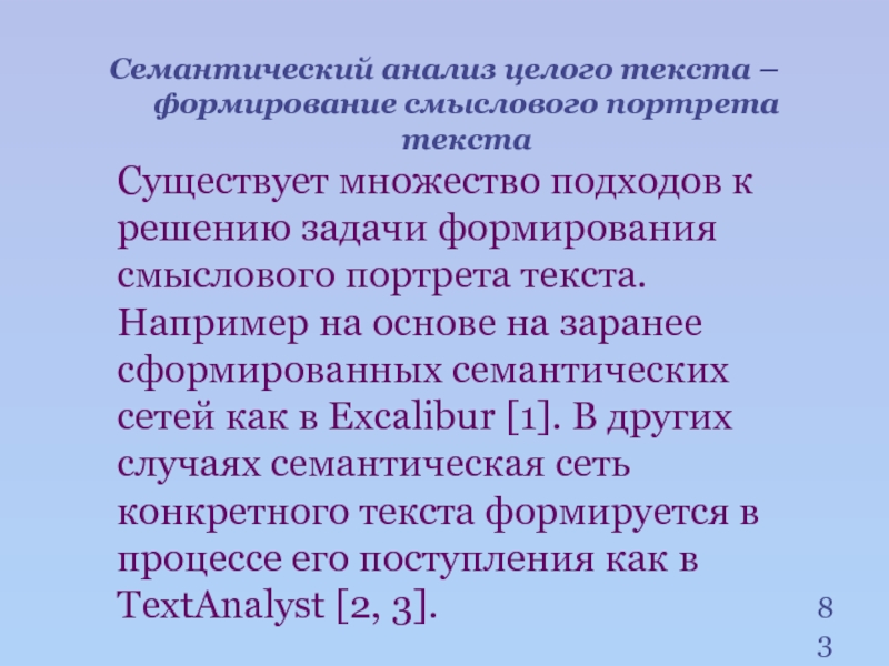 Слайд 83Существует множество подходов к решению задачи формирования смыслового портрета текста.