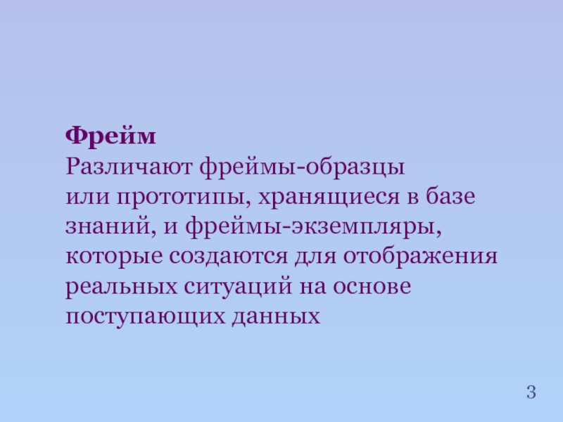 Различают фреймы-образцы или прототипы, хранящиеся в базе знаний, и фреймы-экземпляры, которые создаются