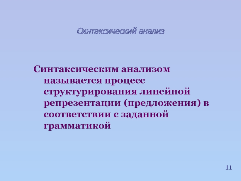 Синтаксическим анализом называется процесс структурирования линейной репрезентации (предложения) в