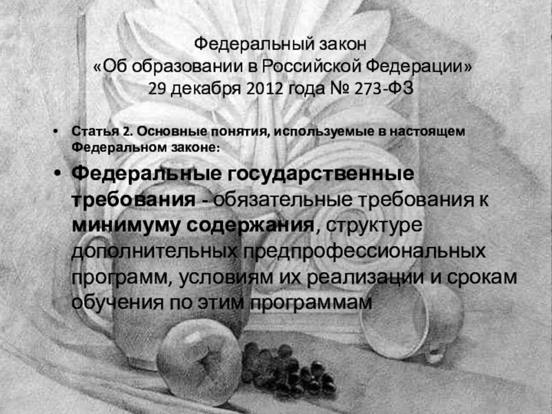Федеральные государственные требования - обязательные требования к минимуму содержания, структуре дополнительных предпрофессиональных программ, условиям их реализации и срокам обучения по этим программам