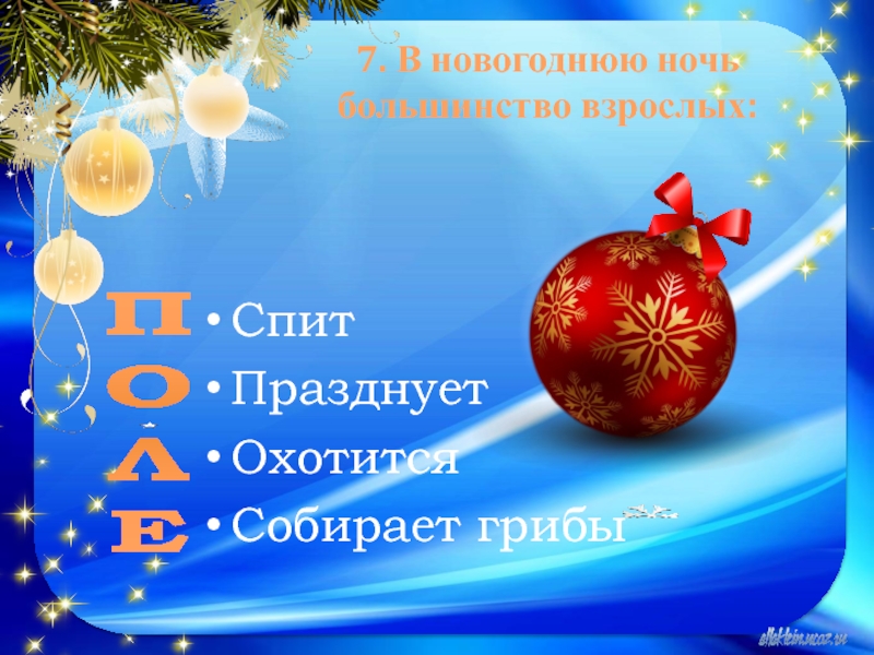 7. В новогоднюю ночь большинство взрослых:СпитПразднуетОхотитсяСобирает грибыПОЛЕ