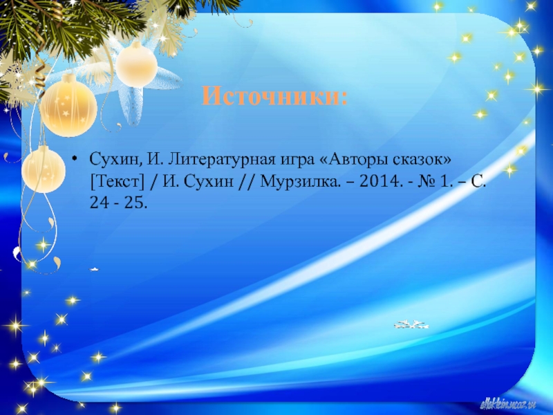 Источники: Сухин, И. Литературная игра «Авторы сказок» [Текст] / И. Сухин // Мурзилка. – 2014. - №