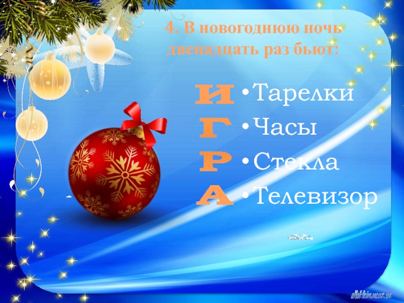 4. В новогоднюю ночь двенадцать раз бьют:ТарелкиЧасыСтеклаТелевизорИГРА