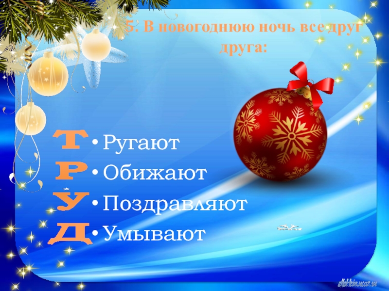 5. В новогоднюю ночь все друг друга:РугаютОбижаютПоздравляютУмываютТРУД