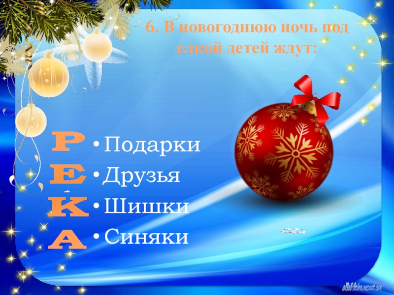 6. В новогоднюю ночь под елкой детей ждут:ПодаркиДрузьяШишкиСинякиРЕКА