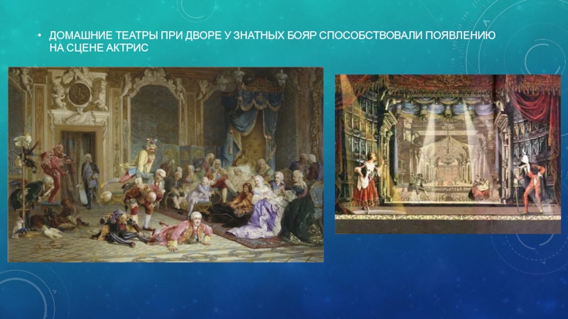 Слайд 16ДОМАШНИЕ ТЕАТРЫ ПРИ ДВОРЕ У ЗНАТНЫХ БОЯР СПОСОБСТВОВАЛИ ПОЯВЛЕНИЮ НА