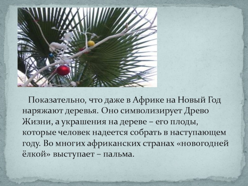 дереве – его плоды, которые человек надеется собрать в наступающем году. Во многих африканских странах «новогодней ёлкой» выступает – пальма.