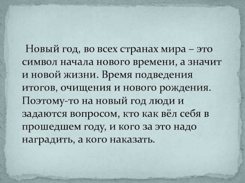 подведения итогов, очищения и нового рождения. Поэтому-то на новый год люди и задаются вопросом, кто как вёл себя в прошедшем году, и кого за это надо наградить, а кого наказать.