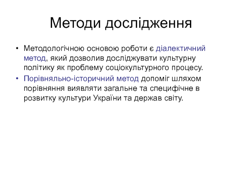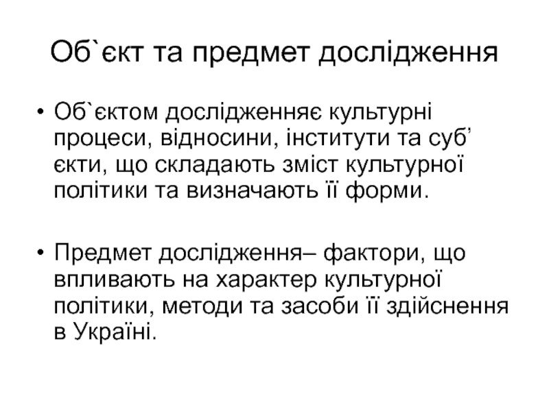 дослідження– фактори, що впливають на характер культурної політики, методи та засоби її здійснення в Україні.