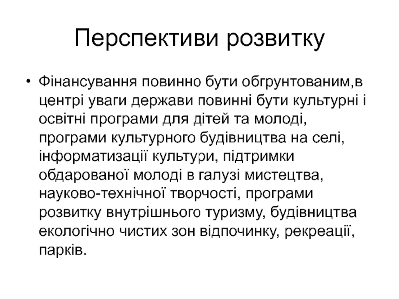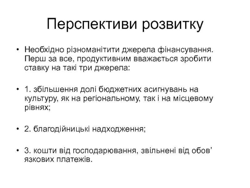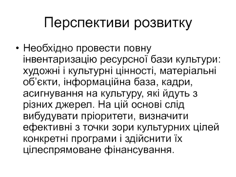 які йдуть з різних джерел. На цій основі слід вибудувати пріоритети, визначити ефективні з точки зори культурних цілей конкретні програми і здійснити їх цілеспрямоване фінансування.