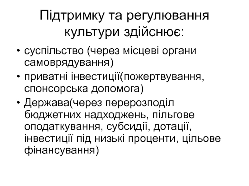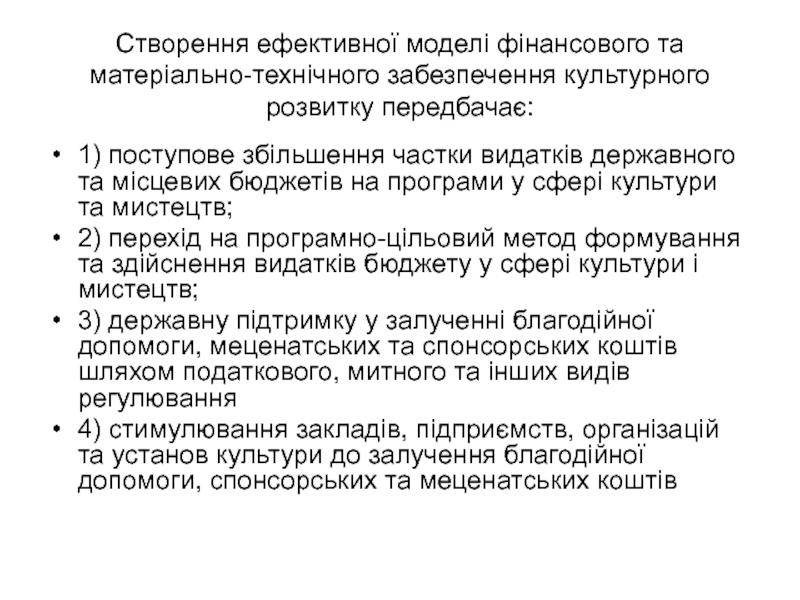 Слайд 13Створення ефективної моделі фінансового та матеріально-технічного забезпечення культурного розвитку передбачає: