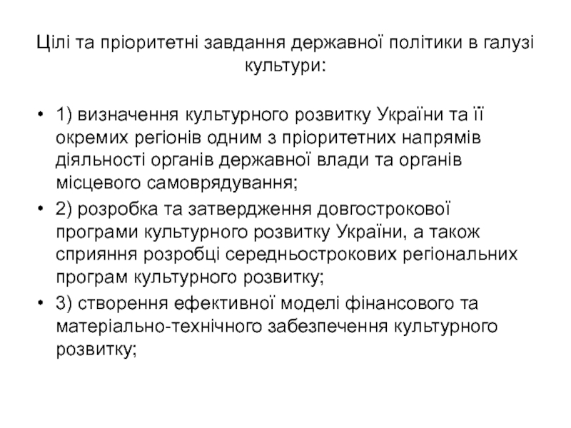 Слайд 11Цілі та пріоритетні завдання державної політики в галузі культури: