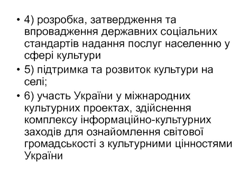 3) забезпечення максимальної доступності культурних благ для кожного жителя України, надання можливостей для розкриття творчого потенціалу особистості.