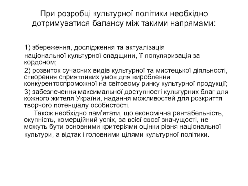 Слайд 18При розробці культурної політики необхідно дотримуватися балансу між такими напрямами: