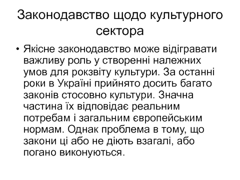 Україні прийнято досить багато законів стосовно культури. Значна частина їх відповідає реальним потребам і загальним європейським нормам. Однак проблема в тому, що закони ці або не діють взагалі, або погано виконуються.