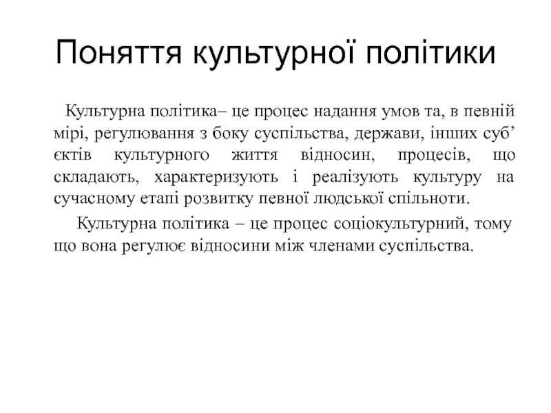 Культурна політика – це процес соціокультурний, тому що вона регулює відносини між членами суспільства.