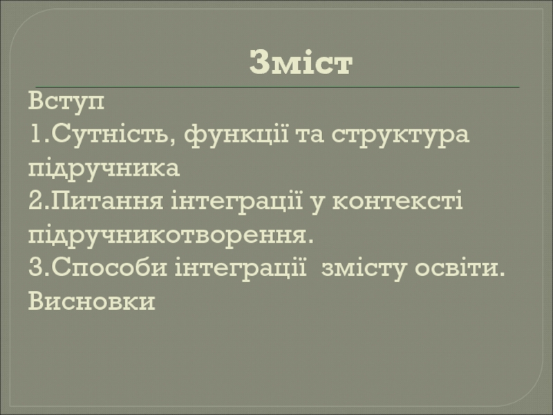 Зміст Вступ 1.Сутність, функції та структура підручника 2.Питання інтеграції у контексті підручникотворення. 3.Способи інтеграції змісту освіти. Висновки