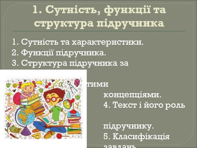 1. Сутність, функції та структура підручника1. Сутність та характеристики.2. Функції підручника.3. Структура підручника за