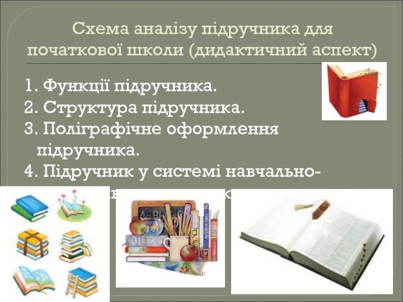 Схема аналізу підручника для початкової школи (дидактичний аспект)1. Функції підручника.2. Структура підручника.3. Поліграфічне оформлення підручника.4. Підручник у