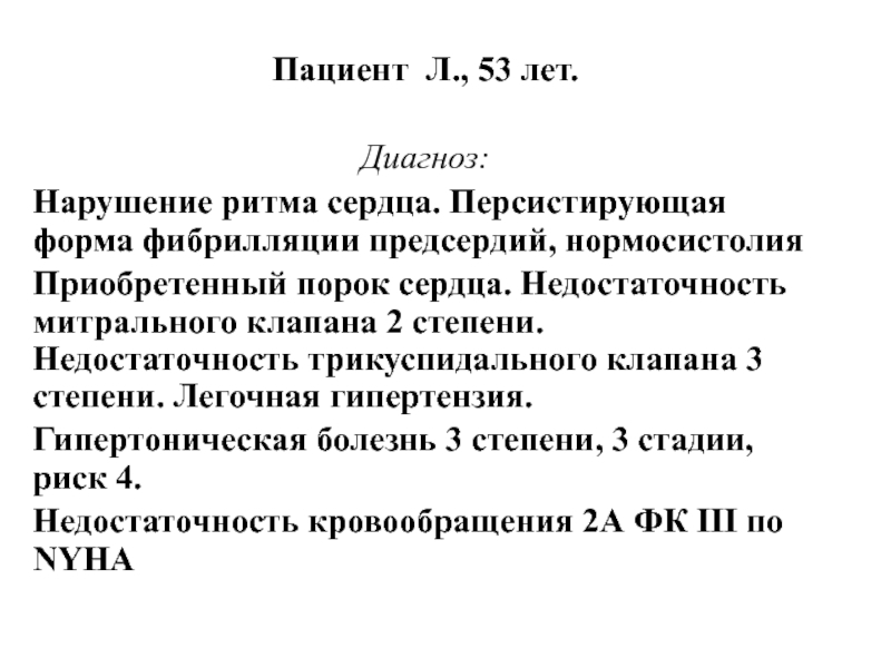 Пациент Л., 53 лет.Диагноз: Нарушение ритма сердца. Персистирующая форма фибрилляции предсердий, нормосистолияПриобретенный порок сердца. Недостаточность митрального клапана