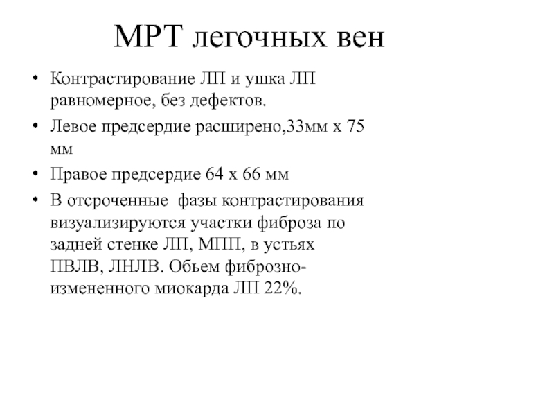 МРТ легочных венКонтрастирование ЛП и ушка ЛП равномерное, без дефектов. Левое предсердие расширено,33мм х 75 ммПравое предсердие
