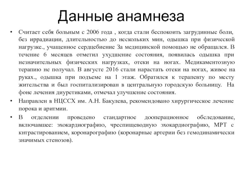 Данные анамнеза Считает себя больным с 2006 года , когда стали беспокоить загрудинные боли, без иррадиации, длительностью