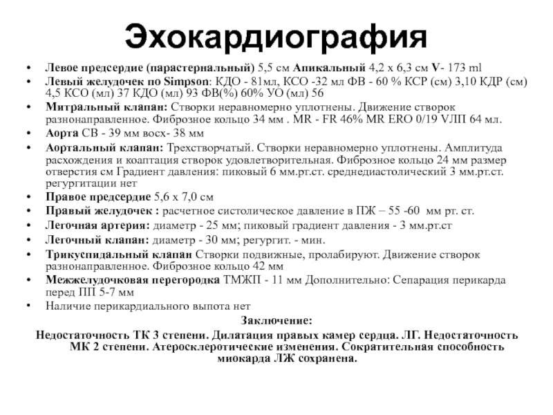 ЭхокардиографияЛевое предсердие (парастернальный) 5,5 см Апикальный 4,2 х 6,3 см V- 173 ml Левый желудочек по Simpson: