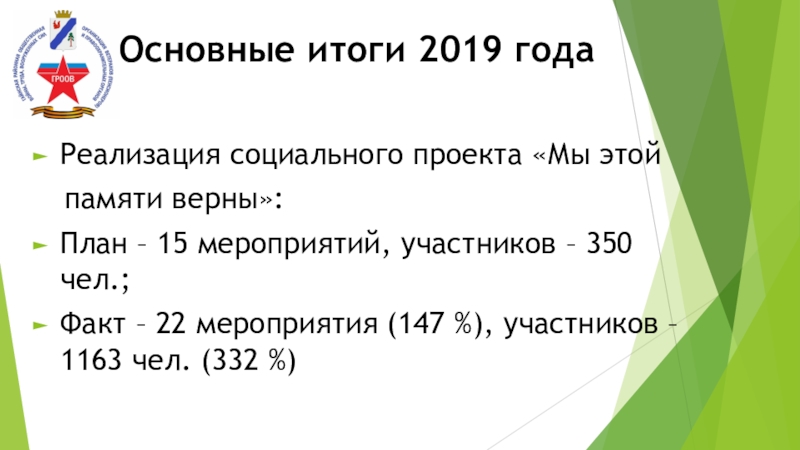 350 чел.;Факт – 22 мероприятия (147 %), участников – 1163 чел. (332 %)