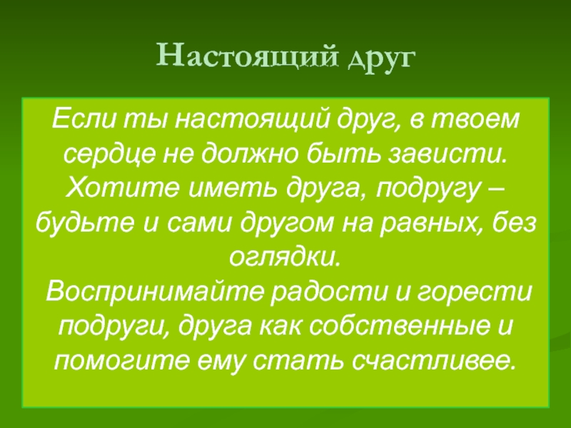 своими ценностями. Он должен делить с тобой горести и радости, быть вместе с тобой в любой ситуации. Настоящие друзья – это те, кому все равно, как ты выглядишь, но не безразлично, что ты думаешь.