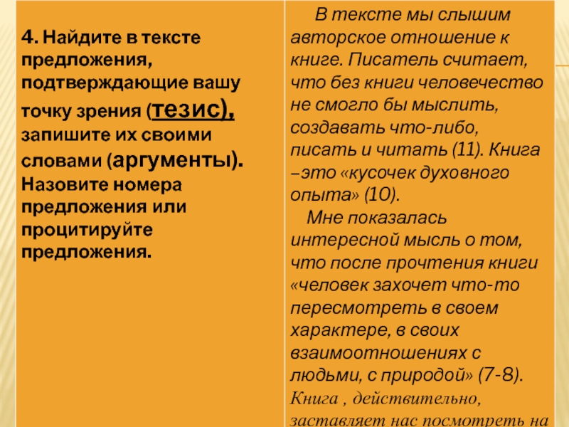 (?) Писатель считает, что без книги человечество не смогло бы мыслить, создавать что-либо, писать и читать (11). Книга –это «кусочек духовного опыта» (10).