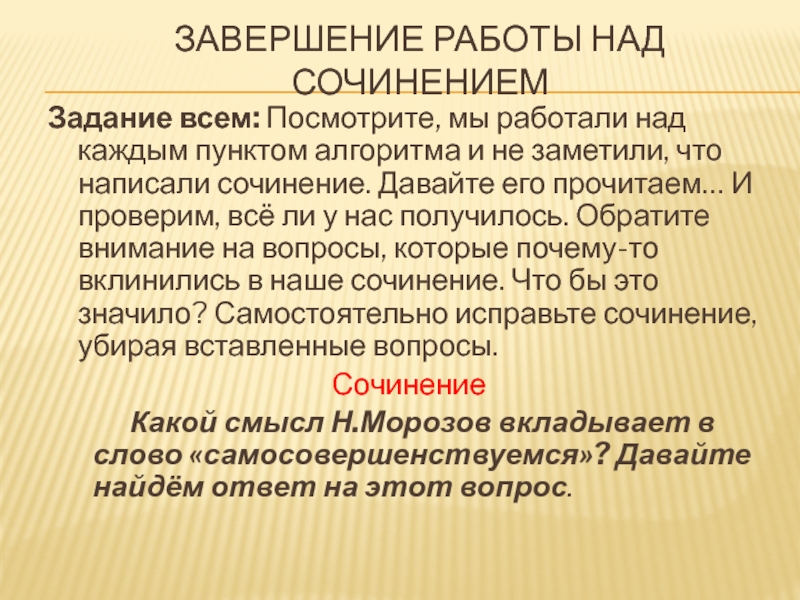 прочитаем… И проверим, всё ли у нас получилось. Обратите внимание на вопросы, которые почему-то вклинились в наше сочинение. Что бы это значило? Самостоятельно исправьте сочинение, убирая вставленные вопросы.