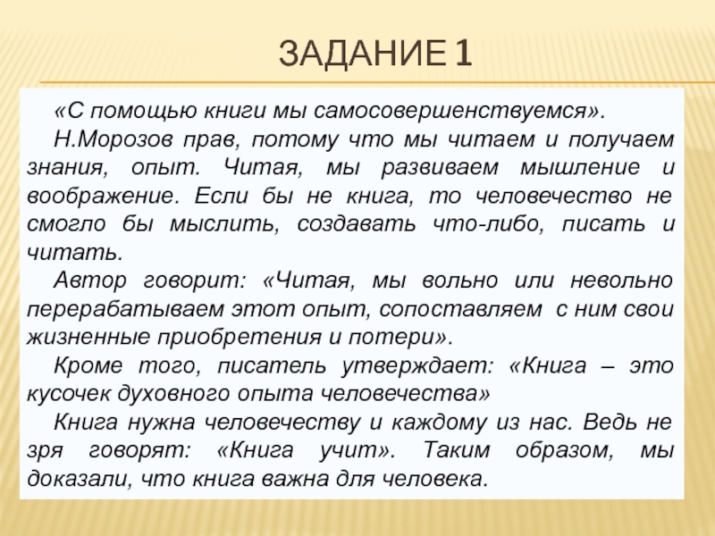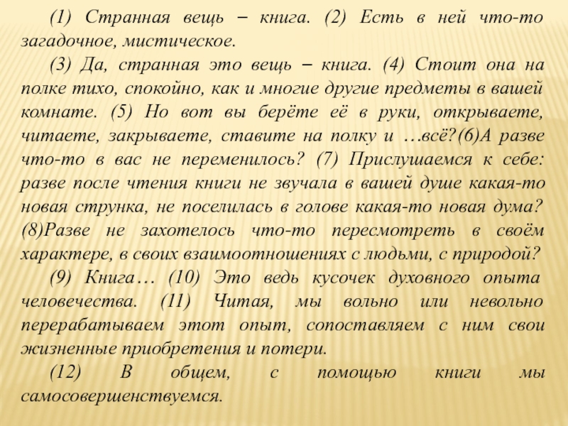 (9) Книга… (10) Это ведь кусочек духовного опыта человечества. (11) Читая, мы вольно или невольно перерабатываем этот опыт, сопоставляем с ним свои жизненные приобретения и потери.