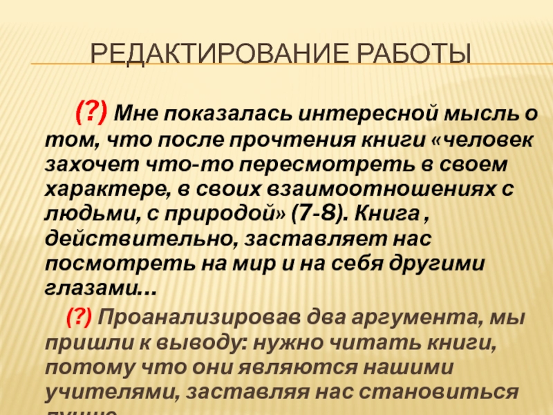 (?) Проанализировав два аргумента, мы пришли к выводу: нужно читать книги, потому что они являются нашими учителями, заставляя нас становиться лучше.