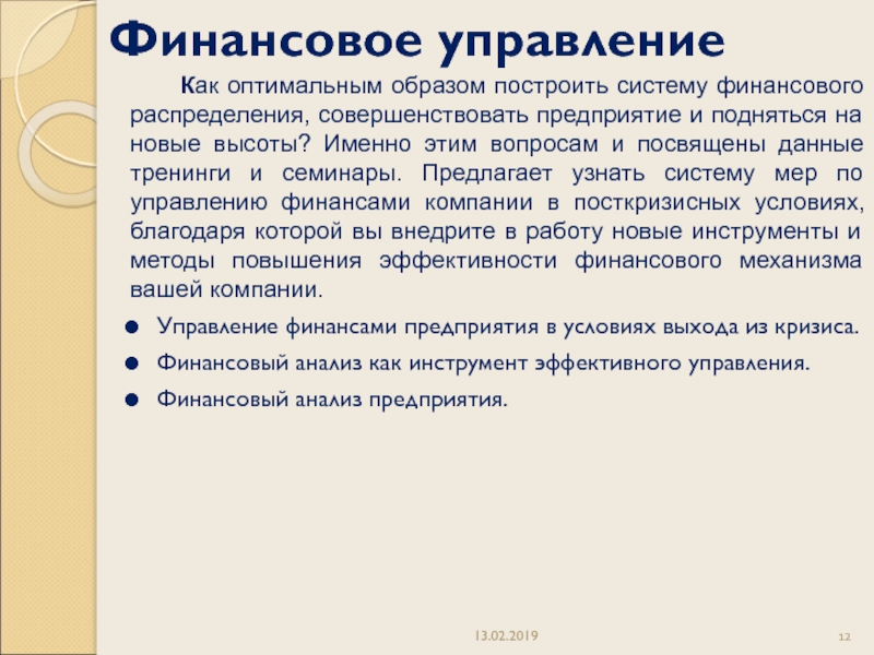 посвящены данные тренинги и семинары. Предлагает узнать систему мер по управлению финансами компании в посткризисных условиях, благодаря которой вы внедрите в работу новые инструменты и методы повышения эффективности финансового механизма вашей компании.
