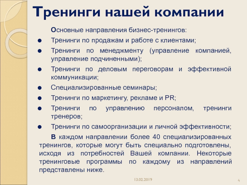 В каждом направлении более 40 специализированных тренингов, которые могут быть специально подготовлены, исходя из потребностей Вашей компании. Некоторые тренинговые программы по каждому из направлений представлены ниже.