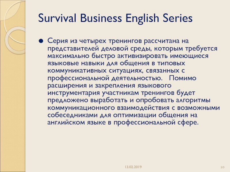 для общения в типовых коммуникативных ситуациях, связанных с профессиональной деятельностью. Помимо расширения и закрепления языкового инструментария участникам тренингов будет предложено выработать и опробовать алгоритмы коммуникационного взаимодействия с возможными собеседниками для оптимизации общения на английском языке в профессиональной сфере.