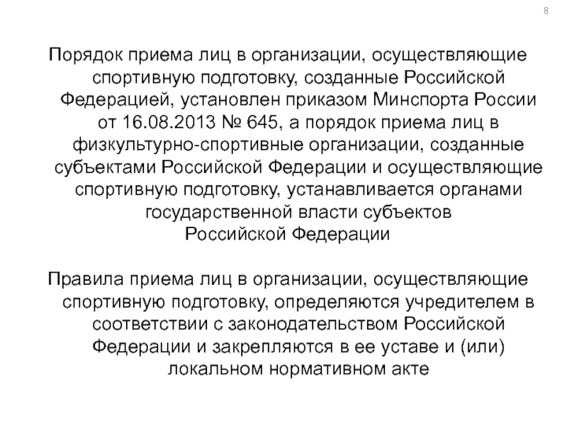 Приказ Минспорта России от 16.08.2013 № 645 «Об утверждении Порядка приема лиц в физкультурно-спортивные организации, созданные Российской Федерацией и осуществляющие спортивную подготовку»