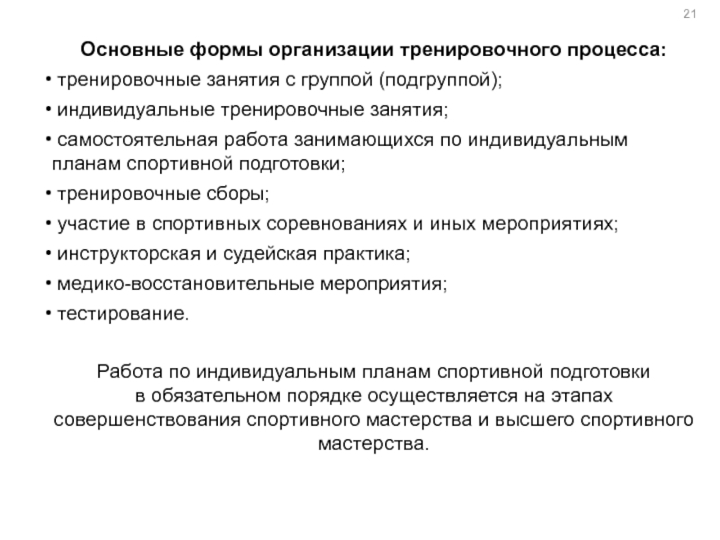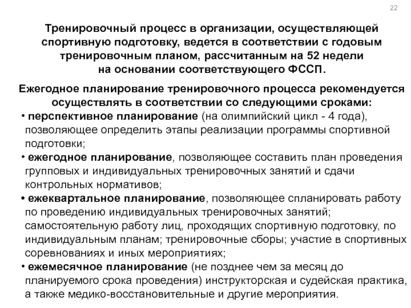 Слайд 22Тренировочный процесс в организации, осуществляющей спортивную подготовку, ведется в соответствии