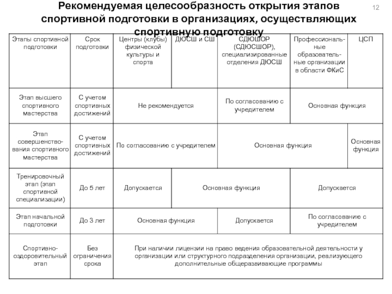Слайд 12Рекомендуемая целесообразность открытия этапов спортивной подготовки в организациях, осуществляющих спортивную