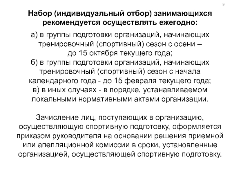 Слайд 9Набор (индивидуальный отбор) занимающихся рекомендуется осуществлять ежегодно: