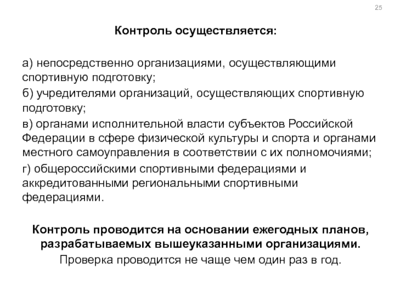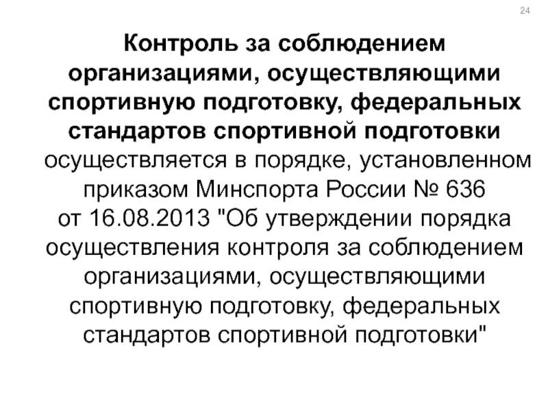 Слайд 24Контроль за соблюдением организациями, осуществляющими спортивную подготовку, федеральных стандартов спортивной