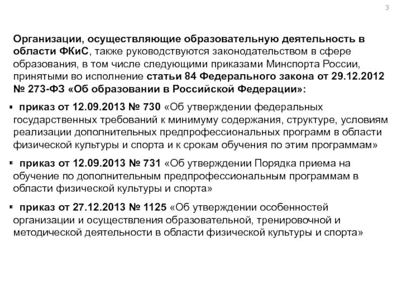 Организации, осуществляющие образовательную деятельность в области ФКиС, также руководствуются законодательством