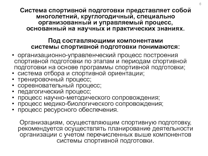 Слайд 6Система спортивной подготовки представляет собой многолетний, круглогодичный, специально организованный и