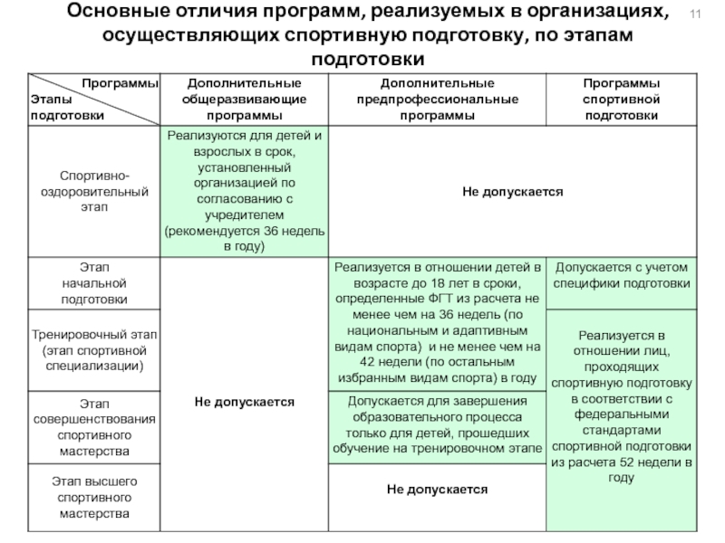 Слайд 11Основные отличия программ, реализуемых в организациях, осуществляющих спортивную подготовку, по